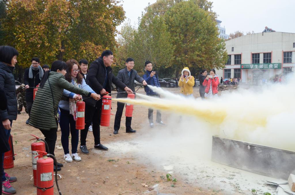 教师在专业人员的指导下,亲身体验灭火器的实际操作。整个演练在紧张有序中顺利完成。