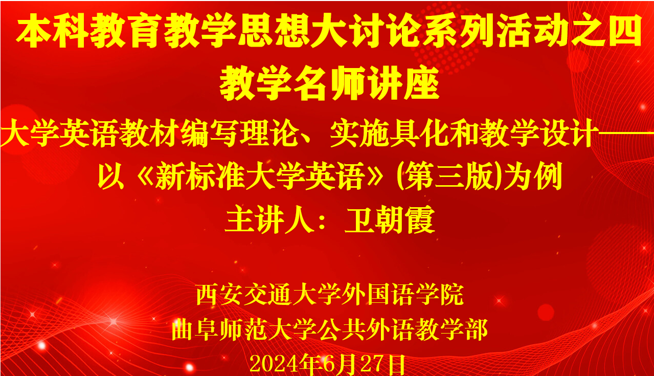 举办本科教育教学思想大讨论系列活动之四:教学名师讲座,特别邀请西安交通大学外国语学院卫朝霞副教授作题为“大学英语教材编写理论、实施具化和教学设计——以《新标准大学英语》(第三版)为例”的专题报告。活动由蜜桃传媒