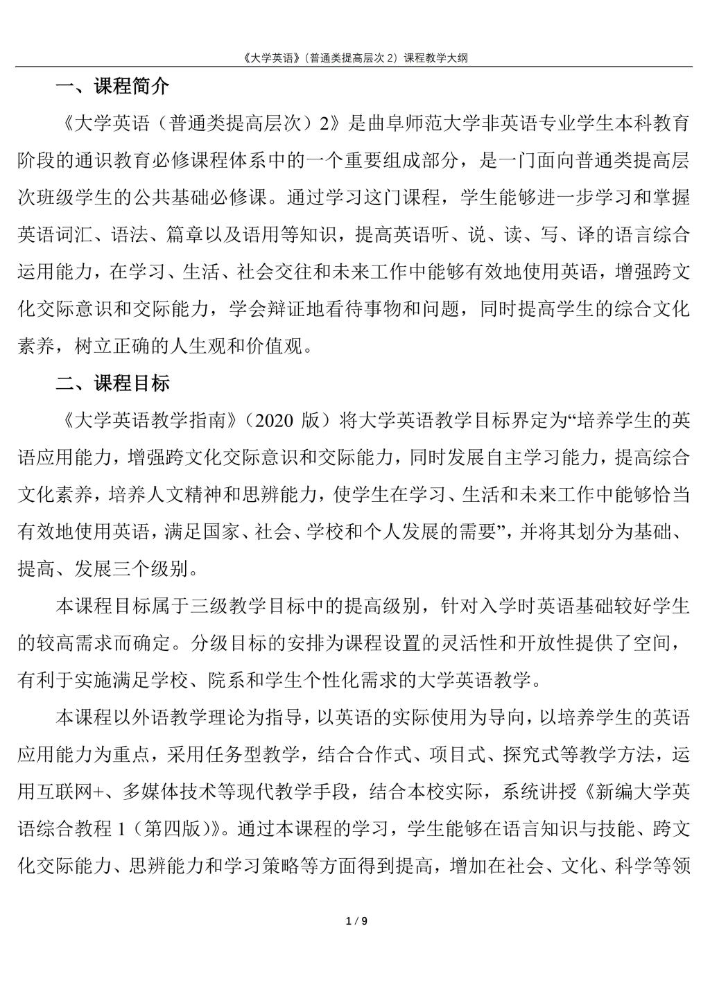大学英语(普通类提高层次2)课程教学大纲(2022版)