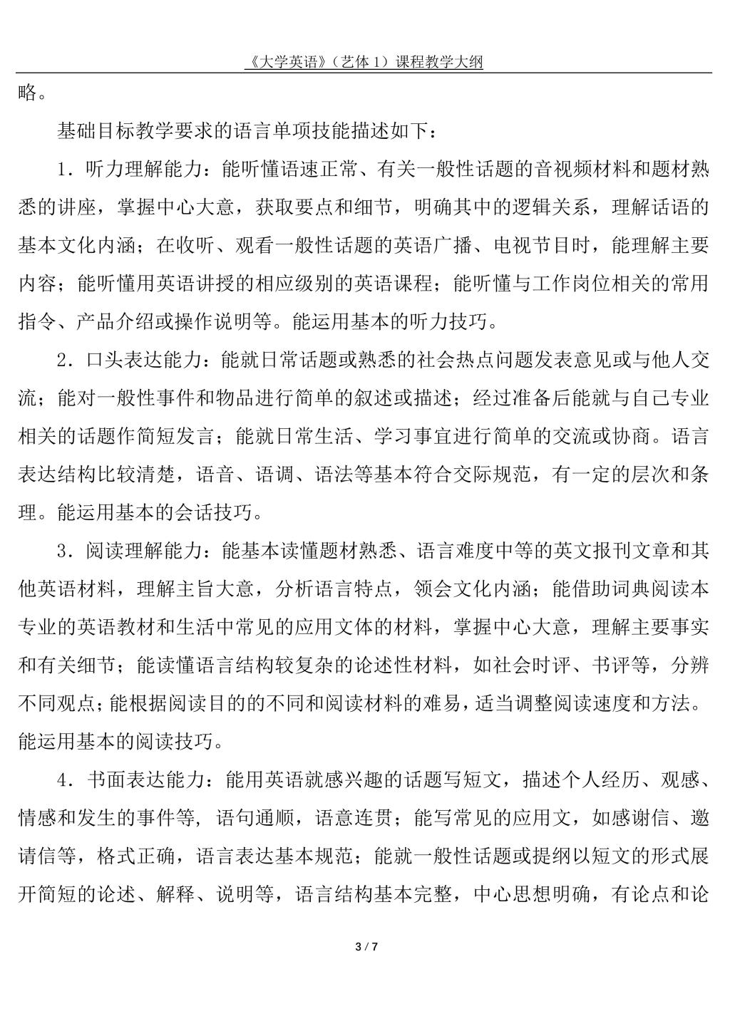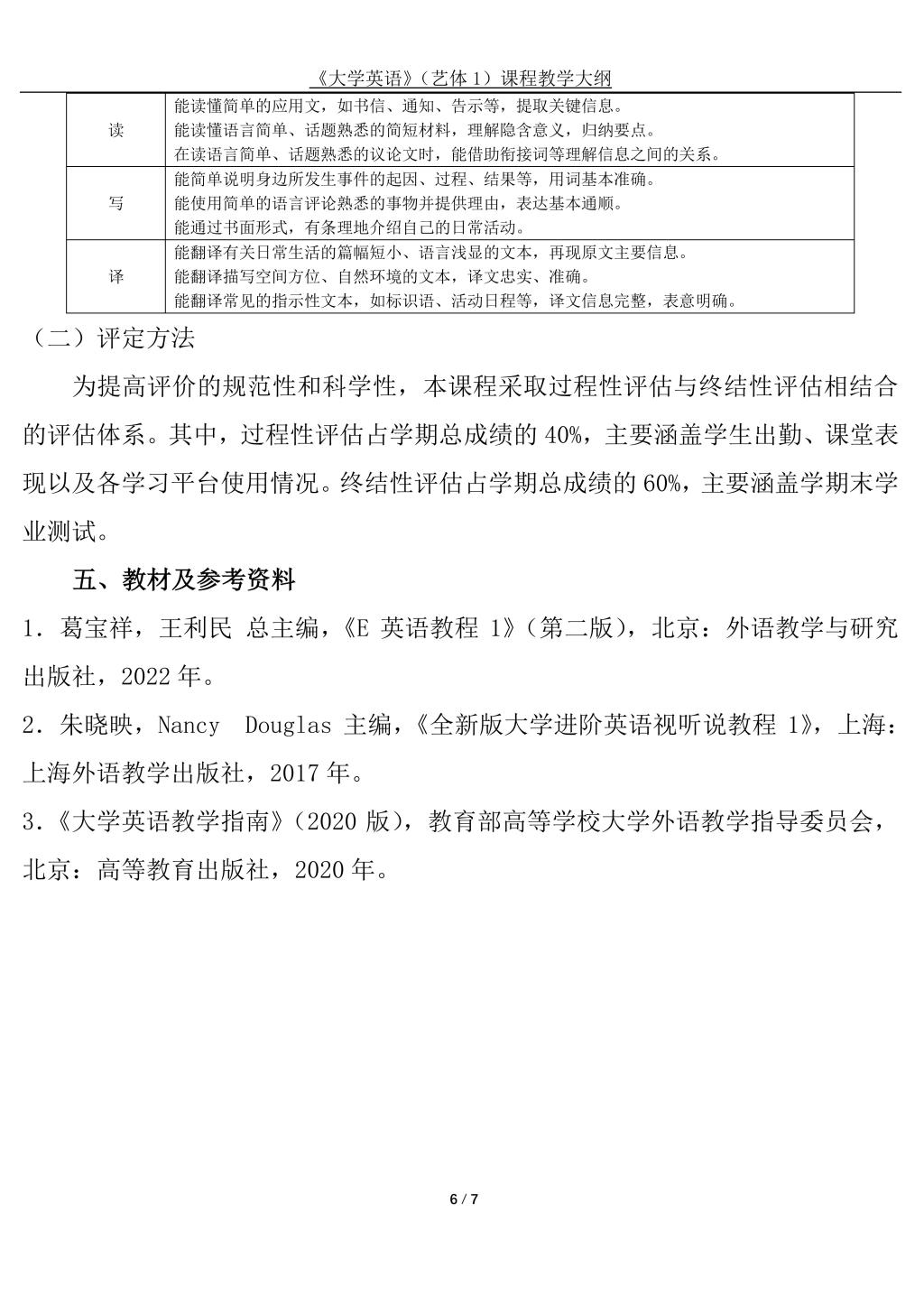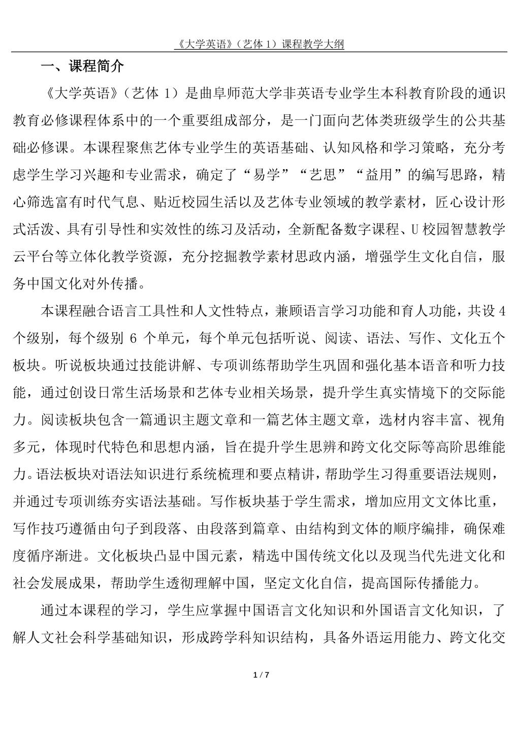 大学英语(艺体1)课程教学大纲(2022版)