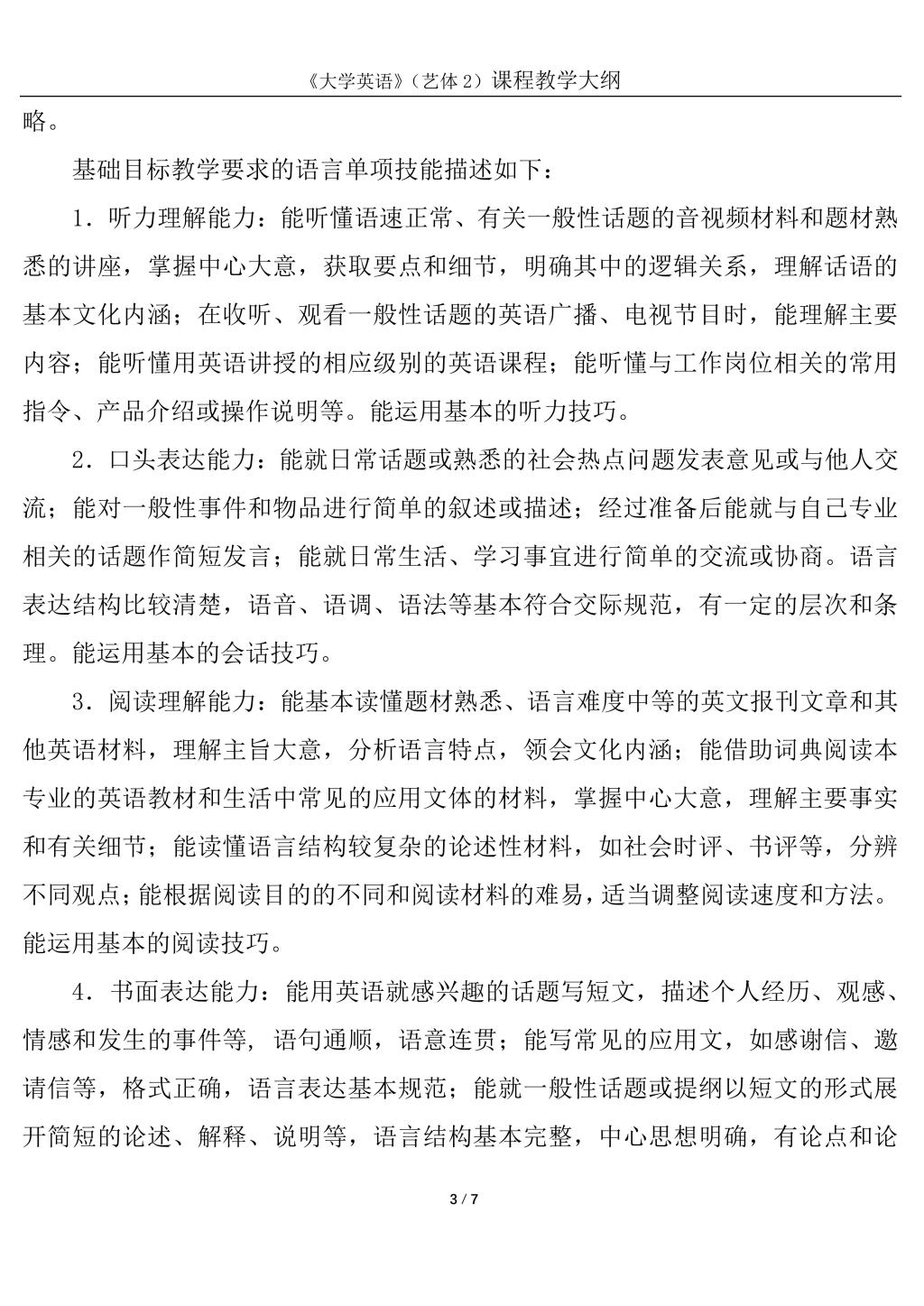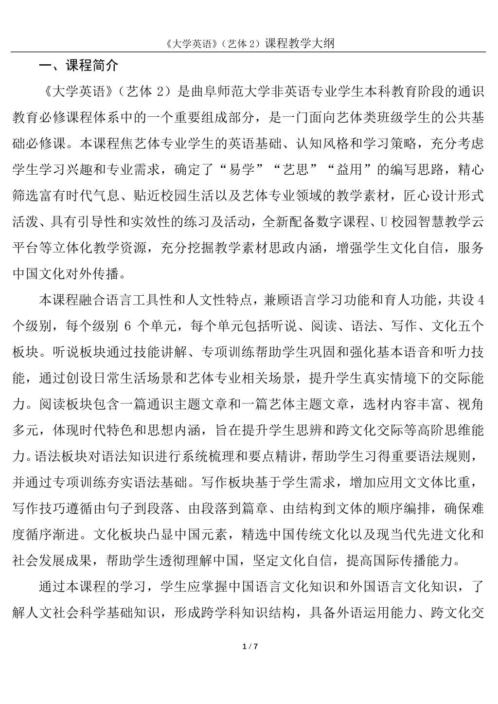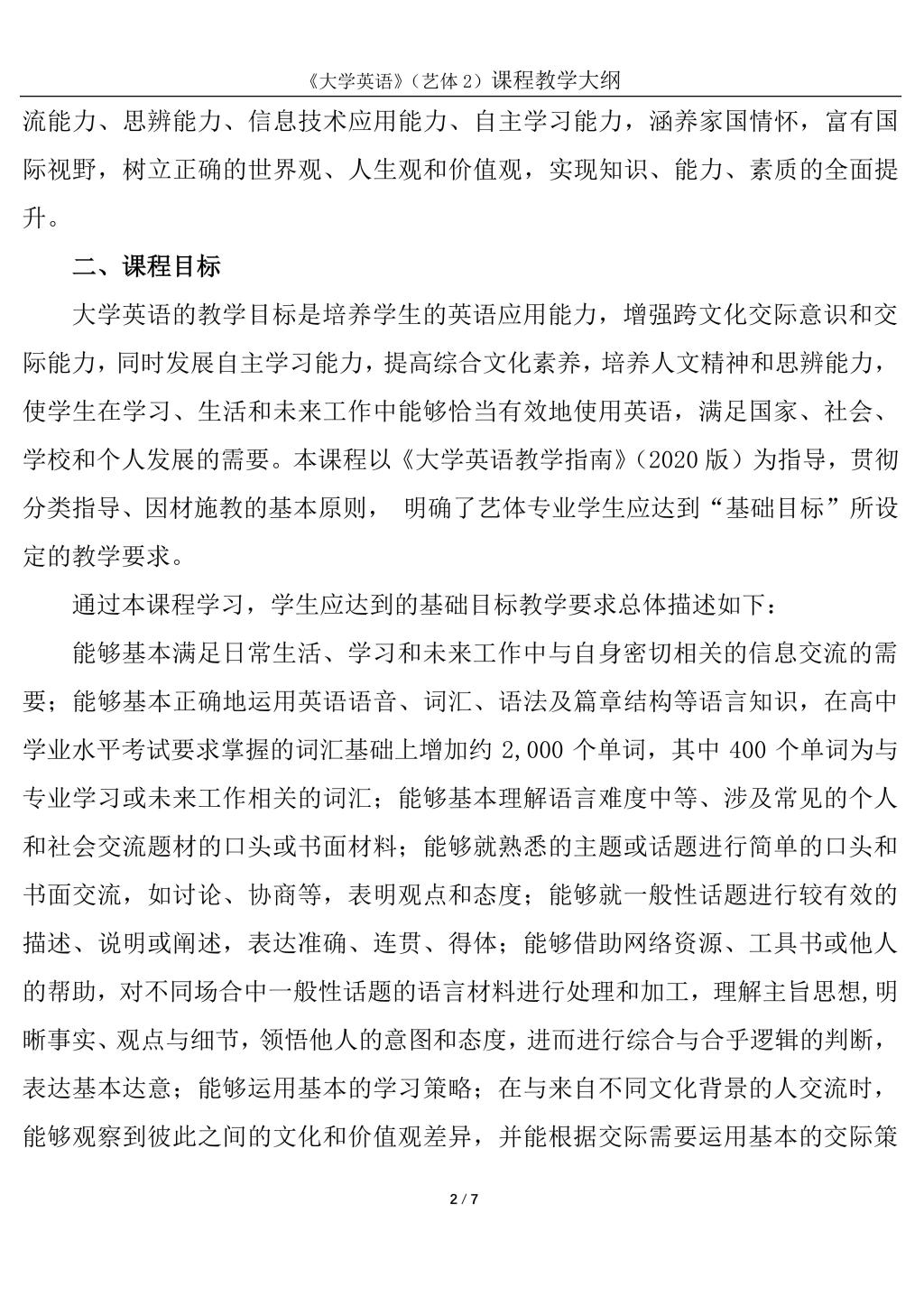 大学英语2(艺体)课程教学大纲(2022版)
