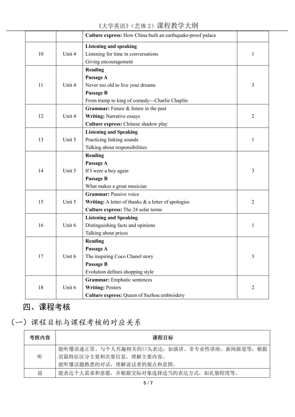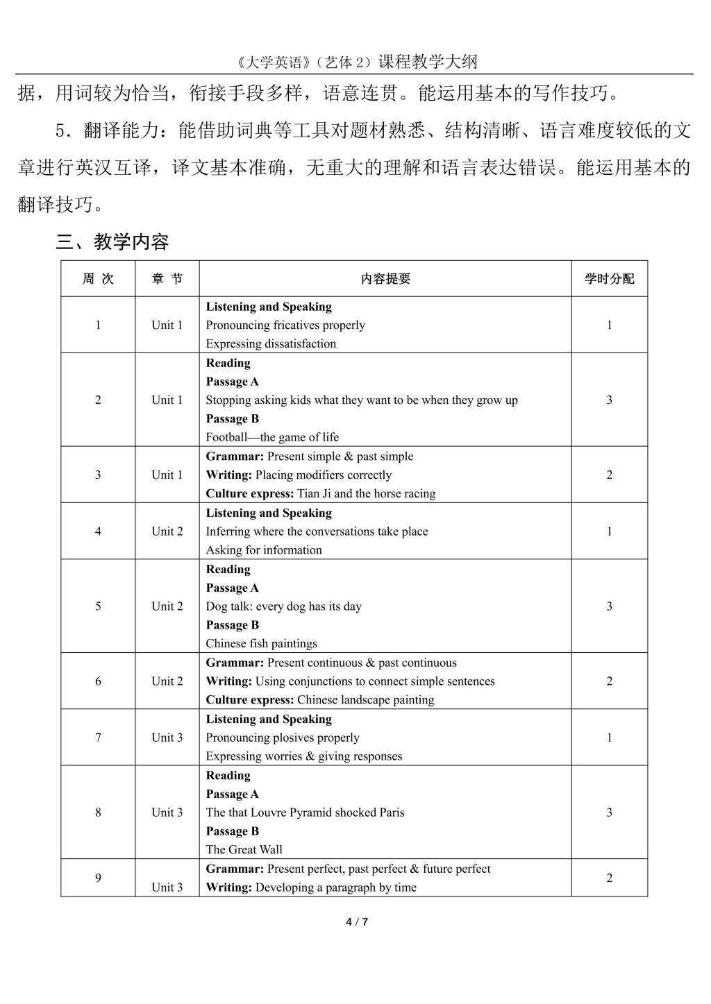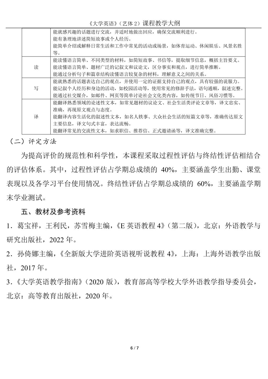 大学英语2(艺体)课程教学大纲(2022版)