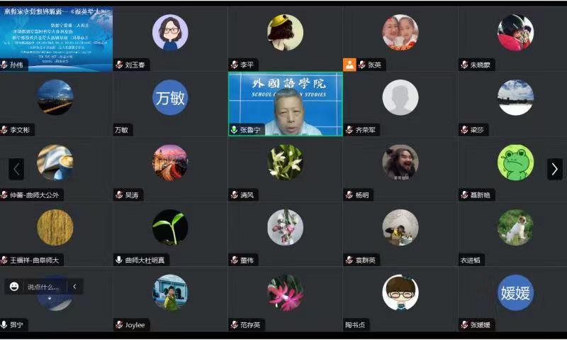 邀请我校优秀校友、南京林业大学外国语学院副院长、张鲁宁教授作“大学英语一流课程建设”线上专家报告会。报告会由副主任孙伟主持,主任王福祥、各教研室主任、各课程建设团队负责人及其全体骨干成员参加。