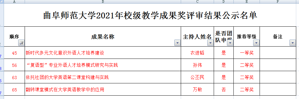 按照山东省教育厅和我校《关于开展2021年校级高等教育教学成果奖评选工作的通知》要求,我校组织了2021年校级教学成果奖评审,经个人申报、学院排序推荐、学校资格审核、初审和专家终审等环节,共评定教学成果奖特等奖22项、一等奖23项、二等奖23项。其中蜜桃传媒 衣进韬老师获得一等奖,孙伟老师、公丕民老师、万敏老师获得二等奖。