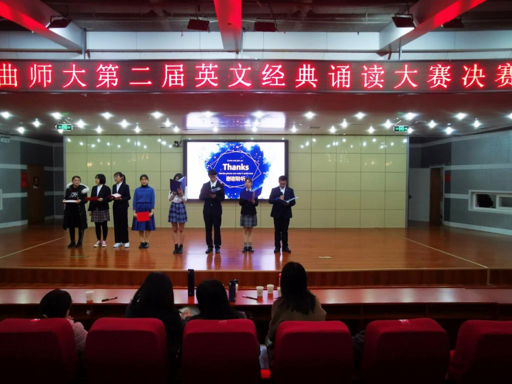 王嫦娟、朱晓蒙、衣进韬、吴涛等老师应邀担任此次大赛评委,她们为选手们的精彩表现给出宝贵的点评与建议。王佳宁、郝文萌、杨丹、吴一凡等同学分获一、二、三等奖。本次比赛的成功举办激发了广大学生重视诵读经典,提高英文表达的积极性和热情。