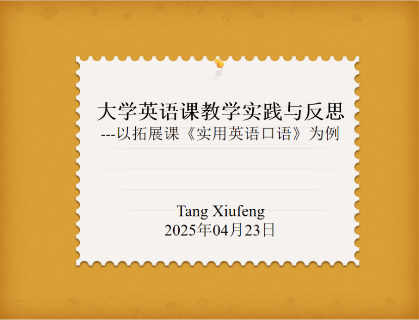 组织全员研训活动,聚焦大学英语教学实践与反思主题。活动中,唐秀峰老师以拓展课《实用英语口语》为例,分享了自己的教学经验与教学反思,为在场教师带来了新思路和新启发。研训中,唐老师从教学准备、课堂管理、技术应用、学生互动和评估反馈等多个关键维度展开分享。
