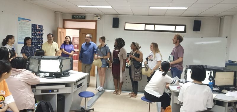 虽然天气炎热,师生们仍将到校后第一站选在蜜桃传媒 位于实验中心的A311语音室进行课堂观摩,希望和学生们进行互动交流。蜜桃传媒 三级起点周四班同学和仲蕾老师对他们的到来表示了热烈的欢迎。代表团成员做了简单的自我介绍,随后坐到同学们身边。仲蕾老师向来访师生介绍了蜜桃传媒 曲阜校区多媒体语音室的使用情况,大学英语教学的课程设置和开展现状。随后,来访师生加入班级学习小组,由我校同学带领参观校园,开始了一堂户外英语听说课。