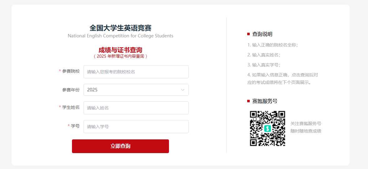 1. 2025年全国大学生英语竞赛,请获得国家特等奖、一等奖、二等奖、三等奖的考生,电脑端输入链接//event.saikr.com/neccs,进入如下界面;输入“参赛院校”、“学生姓名”、“学号”后查询下载获奖证书。(也可手机端下载最新版赛氪APP查询。)
